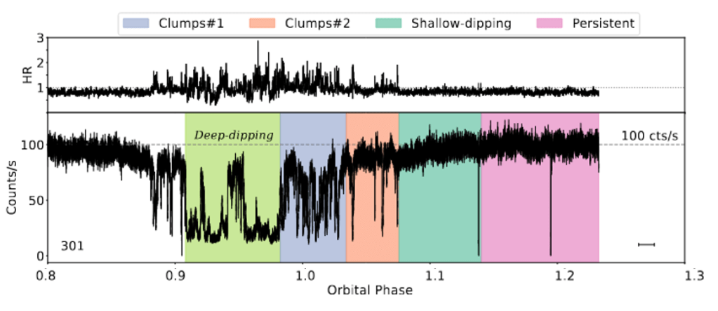 A new, deep look with the XMM-Newton satellite has revealed that the bulge isn’t a solid wall of gas, but more like a cosmic sandstorm. Slicing the X-ray data into different segments revealed that the material hitting the disk is surprisingly complex. Instead of a uniform cloud, the bulge is a multi-phase mixture of both cold gas and highly ionized hot gas. The most striking discovery, however, is just how clumpy the system is. The dipping phenomena isn’t observed as a smooth fade-out and fade-in, but rather as a chaotic series of flickers caused by individual clumps of dense gas passing through our line of sight. By calculating the size of the bulge compared to the shortest flickers in the light curve, we estimated that this turbulent region contains at least 7,000 individual clumps.