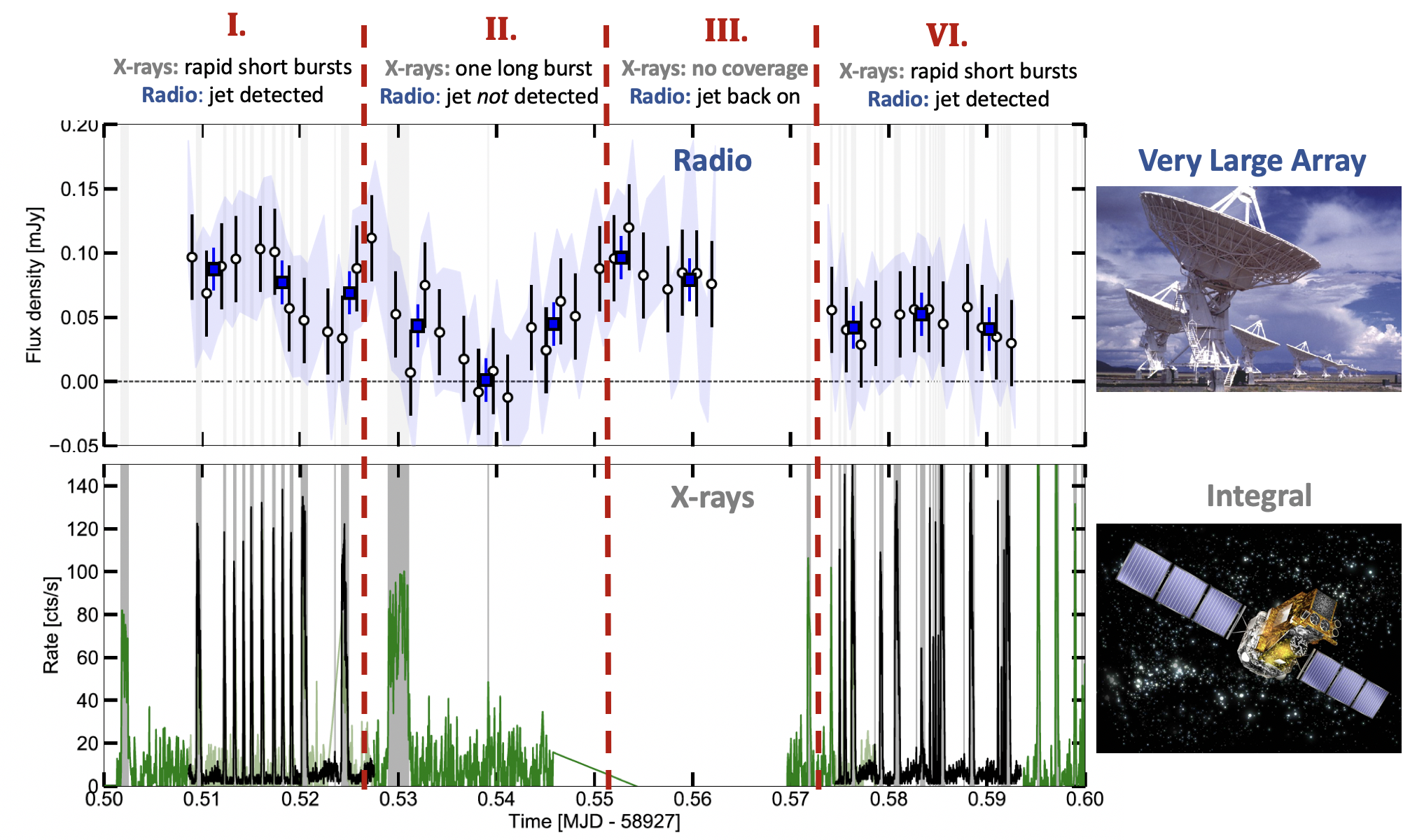 The extreme behavior of Swift J1858 drew a lot of attention in the X-ray binary community and motivated a massive multi-wavelength campaign involving many ground-based and space-based observatories. The fleet of facilities pointing to Swift J1858 involved, for instance, ESA’s XMM-Newton satellite (X-rays), NASA’s NICER mission located on the International Space Station (X-rays), the Hubble Space Telescope (UV), the Very Large Telescope in Chile (UV/optical/infrared), the 10-m Grantecan telescope on La Palma (optical/infrared), the Very Large Array in New Mexico USA (radio) and the Atacama Telescope Compact Array in Australia (radio). All these efforts allowed for an unprecedented characterization of the binary and its extreme variability.